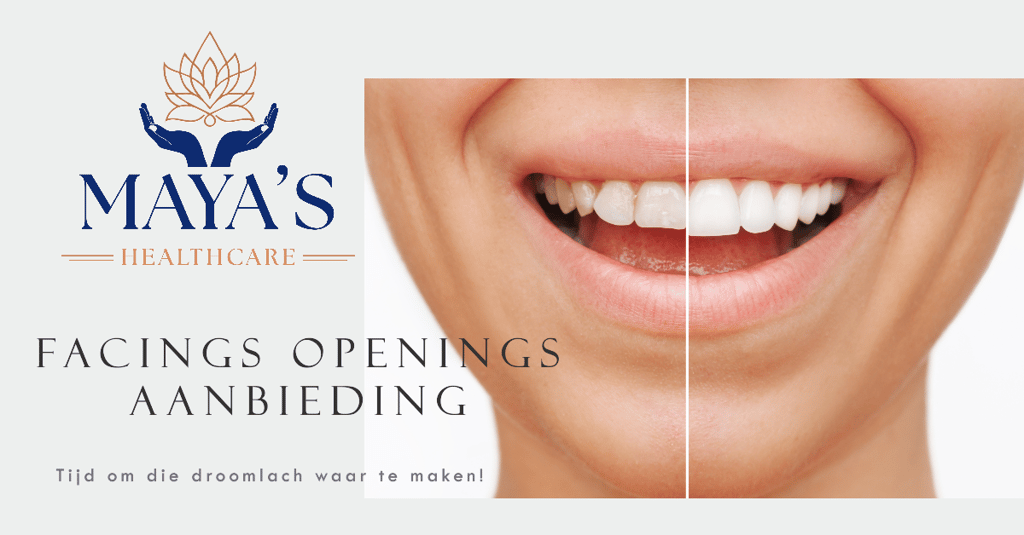 Om de start van deze nieuwe praktijk te vieren, ontvang je nu tijdelijk 10% korting op facings bij Maya’s Mondzorg. Tijdens de intake wordt jouw gebit zorgvuldig beoordeeld en stellen we een op maat gemaakte begroting op, zodat je precies weet waar je aan toe bent.